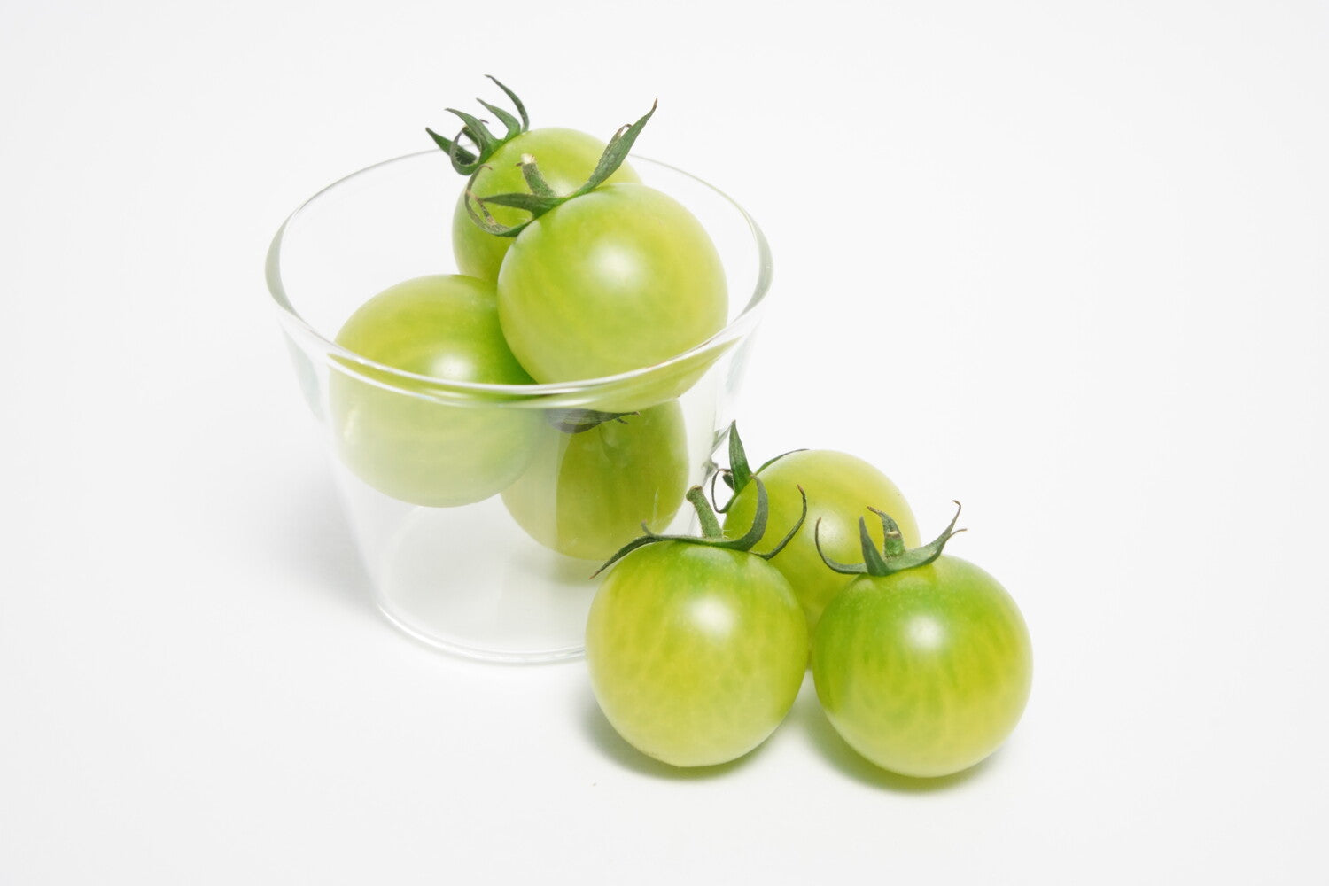 緑色ですがこれが完熟です。皮が柔らかく、甘味が強くて美味しいです。見た目とのギャップがあって驚かれる方が多いトマトです。