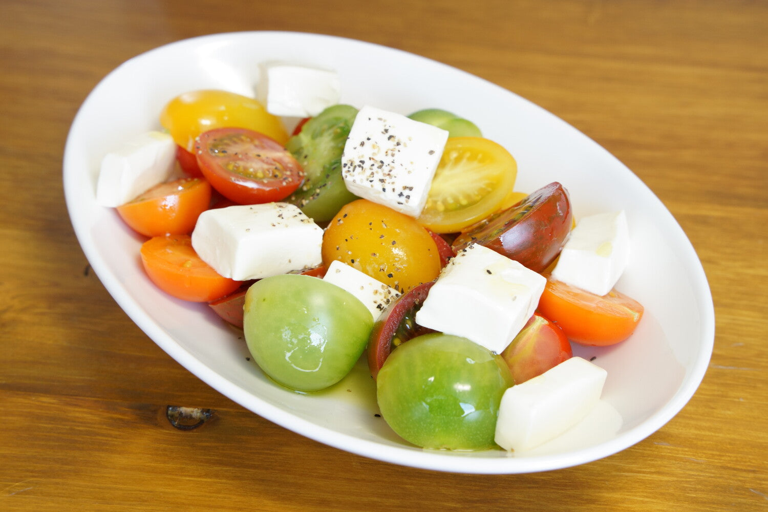 トマトを食べやすい大きさに切り、クリームチーズと一緒に盛り合わせます。あとはオリーブオイルをかけて完成です。